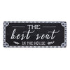 The Lavender & Leaf Sign is a decorative metal cutout sign with a distressed white background and rounded edges. The sign reads “Lavender & Leaf Apothecary”, “producing handmade tonics, powders, and soaps for health & beauty”, “since 1889”, all in fanciful black lettering. The sign displays a black border, as well as detailed lavender flower art. The sign comes with a black chain hanger attached to the top, for a hanging display, and is the perfect addition to bathroom home décor. Measures 7.25 high (11 high with hanger) by 6 wide.
