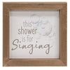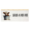 The Scrub-A-Dub-Dub Pig Block is a decorative wooden block sign with a white shiplap background. The sign reads “scrub-a-dub-dub in black lettering and features a pink baby piglet, resting inside of a metal washtub surrounded by mud splatters. This sign is charming and perfect for a farmhouse theme and bathroom space, displayed freestanding. Measures 4” high by 9.5” wide by .75” deep.