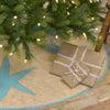 Tastefully adorned by starfish, the Nerine Tree Skirt 48 is a fun addition to the beach Christmas look. The skirt features a textured natural shade cotton jute with appliqued starfish on a ocean blue striped seersucker. Accented with natural braided rope, peal and star studs. Included wooden toggle closures.