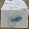 Bring a coastal look to your tabletop with the Sandy runner. Showcasing starfish and seashell stencils on both ends accented with charcoal wave borders on subtle biscotti burlap with fringed edges.
