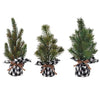 The Pine Trees are an assortment of three decorative tabletop trees made of textured dark green pine branches. The trees feature a flat base wrapped with red and black plaid cloth, making them perfect for a shelf or tabletop during the Winter and Christmas season. Each tree measures 21” high.