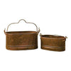 Beaded Trays is a set of three rustic wooden trays with a border of wooden beads. Trays feature a white and brown color scheme and stand on four rounded feet for freestanding display. Trays come with two jute handles for easy transport and optional hanging display and they look great displayed with a candle and greenery, decorative fillers, or small framed signs. Small measures 2" high by 14.5" wide by 8" deep; medium measures 2" high by 17" wide by 9.5" deep; large measures 2" high by 20" wide by 12" deep.