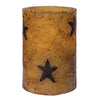 Enjoy warm, flickering candlelight, without the flames! LED pillar with a antique ivory real wax candle sleeve and grungy cinnamon coating. Switch on bottom turns candle on, off, or sets the internal timer on for 6 hours, off for 18. Candle will switch back on at time it is set! Average life is 40-48 hours on 3 AAA batteries (not included). 4-1/2 tall and 3 wide.