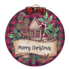 Rustic Gnome Sweet Gnome Round Sign is made of wood and features a jute hanger for wall display. It depicts a Santa gnome in red and black check clothing next to two Christmas trees and a wooden sign that reads, "Gnome Sweet Gnome" in brown text. Sign is further accented by a red plaid border and it measures 11.5" in diameter by .5" deep.