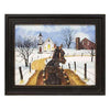 Snowy White Barn Framed Sign is a framed art print that depicts an old white barn after a fresh snowfall. It is enclosed in a dark wood frame and has a keyhole opening at the back for easy mounting. Print is perfect for winter display and looks great hung in an office, an entryway, or above a mantel.