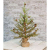 Snowy Cypress Pine Tree features wired branches and stiff green needles with pinecone accents and a frosting of glittering snow. The tree has a wrapped burlap base and measures 2 feet tall.