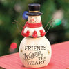 Christmas Caroler Doll is a prim fabric doll that looks as if she’s ready for an evening of caroling. The stuffed fabric doll has brown yarn hair and a festive outfit comprised of a brown cap, red and tan striped skirt, a green shawl fastened with two buttons, and a vibrant red fabric scarf. She has tiny bead eyes, a prim stitched nose, painted red lips, and she holds a rusty metal jingle bell suspended by a jute hanger. The weighted doll measures 19” high.