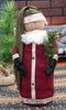 Christmas Caroler Doll is a freestanding primitive doll made of tea-stained fabric. Doll features brown, yarn hair and a weighted bottom and wears a brown cap, green shawl, red scarf, and a red and tea-stained skirt with a red belt. Doll holds a grungy, metal jingle bell in both hands and has two black bead eyes and painted facial features that pairs well with similar Christmas plush dolls. Measures 19" high by 5.25" wide.