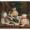 Hazel the Gnome is a plush snowman doll with a striped green body, metal snowflake button details, and long, braided pigtails. She wears a green and red patterned Christmas cap tipped with a white pompom for a cozy winter look. Hazel is the perfect holiday decor item for gnome lovers! Measures 7" high by 3" wide.
