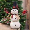 Let It Snowman with Shovel on Base is a freestanding wooden snowman that is made in the USA. Snowman has a distressed finish with raw edges and tan paint that resembles old snow. Snowman has a black, wide-brimmed hat with a painted snowflake accent, a black painted smile, orange carrot nose, and a plastic pine accent that is attached to a wooden, red box. Snowman is attached to a sturdy wood base and reads, "let it snow" in large, white letters. Measures 24" high by 13" wide at the base.