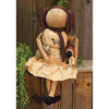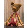 Hannah Bear is a primitive, stuffed bear with an aged appearance, a long nose, and brown bead eyes. She is wearing a vintage floral dress and a lace bow. Her name tag is pinned to her dress with a rusty safety pin. Measures 9" tall when seated and 12" tall overall. Please note: item is intended for decorative purposes only.
