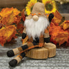 Janel Doll is a rustic country doll with crimped, brown yarn hair and drawn facial features. She wears a quilted star pattern dress with a tea-stained, muslin apron. Under one arm, she holds a stuffed pig with a curly wire tail and a jute wrap around its body. She also has a paper name tag pinned to her outfit. Measures 11” high in a seated position, or 24" high by 7" wide and 2" deep overall.