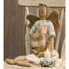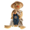 Vickie Doll is a cute country doll with brown yarn pigtails and black bead eyes. She wears a tea-stained dress with a ruffled bottom and has black, painted shoes. She holds a woven bonnet in her hands that is accented with flowers and a blue bow. Measures 13" high (8" high when seated).