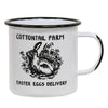 A small enamelware white mug with a distressed look on the rim, handle and bottom edges. 2-1/4 in diameter.
