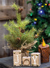 Pine Tree features wispy branches with pinecones and a burlap-wrapped base. It stands 18" high.
