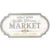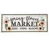 Humble Bee Flower Market Sign is a wood sign with a vibrant spring design. Sign reads, "humble bee - flower market - honey - seeds - & blooms" in a mix of dimensional wood, thin metal, and engraved lettering and it is accented by a metal bee in its center. Its white background is engraved and textured like honeycomb and it measures 23" wide by 9.5" high.