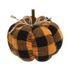 The October 31st Mini Pumpkin is a decorative plush pumpkin figurine made of orange and black buffalo check stuffed fabric. The pumpkin has moss detailing and a wooden stem, along with a linen ribbon reading “Oct 31st”, fastened with a rusty pin. This pumpkin makes a primitive, rustic addition to the home during the Fall and Halloween season, displayed sitting on a tray, riser, shelf, or table. Measures 4” high and 3” in diameter.