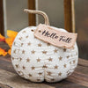 The Harvest Owl is an autumnal tabletop plush made of fuzzy brown fabric with orange and brown plaid fabric detailing. The owl has plush brown feet, orange and raffia beaded eyes, and is adorned with a natural burlap top hat. This owl sits freestanding and can be displayed on any shelf, tabletop, or other flat surface for a sweet, rustic addition to Fall home décor. Measures 7.25” high by 6” wide by 3.5” deep.