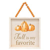 Happy Fall Buffalo Check Hanging Pumpkin is made of wood and reads, “Happy Fall” in a mix of orange and black text. Pumpkin has a black and white buffalo check frame and it is accented by an orange and black bow. It hangs on a rustic metal wire and measures 9.5 high by 8.5 wide by .5 deep.