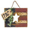 Add a touch of patriotism to your home for Independence Day with our Lath American Flag with Star! Lath Flag with Rusty Star is a rustic flag hanger that is made of slatted wood. Flag is painted in a distressed finish, and is accented with a rusty metal star, angel vine, and raffia. Hangs on a thin wire loop. Measures 12" wide by 7" high and 1" deep.