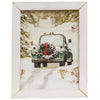 Bring the coziness of a country Christmas landscape into the home with The Pap's Truck Framed Print, White Frame. This art print features an old-style pickup truck with a holiday wreath and a bright red barn with a snow-laden forest in the background. It is enclosed in a white washed frame and has a wood backing with a keyhole opening for easy wall display. Measures 13" by 19" with the frame and 12" by 18" without the frame.
