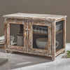 Aged Four Drawer Cabinet is made of rustic wood with three small drawers on one side, one larger drawer on the other, and two small cubby holes for storage. It is 11" high by 21" wide.
