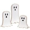 The Bat Chunky Sitters are a set of three decorative wooden cutout figurines in the shape of bat silhouettes. The bats each have a black painted finish and display leaning freestanding, perfect for a riser, tray, shelf, or table to bring a simple, festive touch to the home during the Halloween season. The bats are .75” deep and vary in size for a dimensional display. Small measures 1.25” high by 3.5” wide. Medium measures 1.75” high by 4.5” wide. Large measures 2.25” high by 5.5” wide.