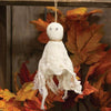 The Baby Pumpkin & Bat Ghost is a decorative wooden sitting figurine in the shape of a ghost silhouette, complete with a white painted finish and painted eyes. The ghost features two wooden cutout graphics on the front, one a black bat and another an orange pumpkin. This ghost is a charming and festive addition to any home during the Halloween season, making a perfect addition to a riser or tray. Measures 3” high by 2.25” wide by .75” deep.