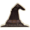 The Witch Dog Ornament is a petite plush ornament made of tan felt with black stitched facial detailing. This smiling dog is decked out for Halloween, decorated with a pointed black and orange hat, a fuzzy black cape, and a sparkling gold bowtie. This dog is the perfect little addition to Halloween home décor and measures 5 high and 2.25 in diameter.