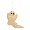 The Ghost Gnome Ornament is a decorative wooden cutout ornament in the shape of a tall, pointed ghost with a distressed ivory finish. The ghost has a round gnome nose and holds an orange wooden jack-o-lantern graphic for a spooky touch. The top of the ornament includes a jute loop for a hanging display on a tree or knob, bringing a festive addition to the home during the Halloween season. Measures 4.75” high by 2.25” wide.