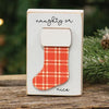 The Gnome Knit Stockings are an assortment of two fabric stockings featuring gnome faces with a round nose and fuzzy white beard. One stocking has a red knit bottom with a red and gray Nordic pattern hat, and the second stocking has a red and gray striped bottom with a red knit hat. Each stocking includes a red fabric loop at the top to use for a hanging display, perfect for placing on a fireplace mantle, shelf, or wall during Christmas. Each stocking measures 19” long by 11” wide by 1.5” deep. Please note: This item features a variety of designs which are each sold individually (not as a set). When you order the price break quantity of 6, you will receive 3 of each style.