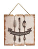 Farmers Market Arrow is a metal wall hanger with an arrow design. Arrow features cut out lettering detail that displays the phrase, "Farmers' Market." Sign has a duck egg blue, painted finish with areas of rusty distressing. Hangs on a jute cord. Measures 24" wide by 7¼" high with a 7½" high hanger.