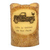 3"x4.5" is a battery-operated pillar candle that reads, "home is our happy place," over a grungy, textured wax finish. Pillar has a standard on/off switch and a built-in timer that runs for 6 hours, then off for 18 hours. It requires 3 AAA batteries (not included) and measures 4.5" high by 3" wide.