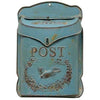 The Aged Black Post Box is made of embossed metal with a worn finish. It has two hinged doors at the top, as well as a hole for hanging. The front of the box reads "Post No. 1." The piece measures 17" high by 8" wide.