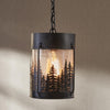 Laser cut scene over bubble glass. Punched Pinecone detail around top of pendant. Black finish.3 foot adjustable chain,7 feet of cording and coordinating ceiling plate included. 60 Watt.