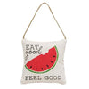 Choose Happy Lemon Pillow Ornament is a spring ornament that comes ready for display by its jute hanger. Pillow has a white front with a red gingham pattern on the back and it reads, choose happy in black text. It is accented by a lemon graphic in the center and measures 5.5 high by 4.25 wide by 1.25 deep.