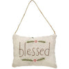 Family Pillow Ornament is a stuffed fabric pillow ornament with an embroidered design and jute hanger. It has a green back and the front reads, family in black text with embroidered holly bough accent. Measures 4 high by 4 wide by 1.5 deep.