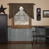 • Primitive Country Prairie Swag — Includes two 36 by 36 by 18 inch prairie-style swag panels with adjustable drawstring ties to modify the look of your curtain set. Prairie curtains are a classic country style featuring long, angled drapes to frame your window while leaving a triangular space open for additional natural light. Our prairie swag feature the shorter length of swag curtains styled for classic country charm.