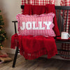 The 14x22 Emmie Jingle Pillow features red "JINGLE" lettering on bright white cotton between a red check bias boarder with silver bells. Reverses to red and white check. 100% cotton with polyester fill.