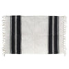 Boho Shag Base Floor Mat is a hand woven mat with a 70/30 cotton/polyester blend. Mat is suited for indoor or outdoor use and it can be cleaned by a vigorous shaking or a gentle cycle in a washing machine (lay flat to dry). It has a black and white finish with geometric patterns and white tassels on each end and it measures 23" high by 36" wide.