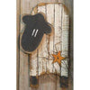 Skinny Sheep with Metal Star on Base is a primitive wooden sheep figure on a freestanding base. Design is accented with a rusty metal star and angel vine details. Measures 18¾" high by 8½" wide and 3½" deep.