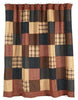 Black and cream patterned fabric shower curtain in bordered with patchwork florals and stripes. Embroidered crow and star accent panels. 72" wide and 72" long. Matches our Kettle Grove collection of products.