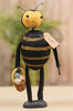 Tyke Bear is a primitive bear doll that features fuzzy brown fabric with sewn-on floppy arms and legs. Bear is wearing a red and white striped scarf around his neck and he is further accented by a paper name tag that reads, "Tyke" in black lettering.  Tyke looks great on a stool or riser and measures 8" high by 6" wide.
