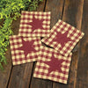 Black & Tan Check Star Applique Round Coasters are a set of four fabric coasters with a primitive black and tan check finish. Coasters come wrapped together with a jute string and bow and each is accented by a black applique star in the center and decorative fringe on the sides. Coasters are a quick and stylish way to protect furniture and surfaces from water rings, spills and drips and they measure 4" in diameter.