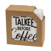 Fall Gingham Resin Coasters sells as a set of four resin coasters. Coasters have a cork bottom for stability and scratch prevention and each design includes a fall plaid pattern to complement seasonal decor. It reads, hello fall over orange plaid; happy harvest over brown plaid; autumn leaves and pumpkins please over tan plaid; or, my favorite color is autumm over gray plaid. Measures 4 high by 4 wide by .3 deep.