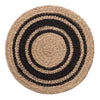 Braided Black Star Jute Coaster is a handmade mat featuring black and tan jute in a circular braided pattern and a stamped star in the middle. Use this trivet to hold hot dishes fresh from the oven and protect kitchen surfaces or top with a candle and ring for decorative use. Measures 8” in diameter and .25” thick. Please note: Due to the handmade nature of this product, some variation in size may occur.