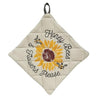 Cinnamon Star Trivet features red, green, brown, and tan jute fibers tightly braided together. It has a red star in the center and measures 8 in diameter.