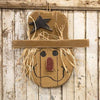 24" Rustic Wood Hanging Scarecrow with Fall Leaves is a primitive wood hanging with a scarecrow head design and distressed finish. Scarecrow is made in the USA and has a brown color scheme, painted facial features, dried raffia, fall leaves, and a dimensional nose for detail. It comes ready to hang for immediate wall display and measures 24" high by 12" wide