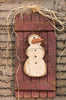 Hanging Welcome Snowman with Buttons is wooden wall hanger with a rustic, painted finish. Item displays the word "Welcome" across the front and includes angel vine, raffia, and gingham accents. Hangs on a thin wire loop. Measures 18" high by 10½" wide and 1½" deep.
