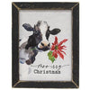 See Clearly Cow Framed Print features a close-up portrait of a fuzzy white cow with black rim glasses. Print has a painted frame with a distressed black finish that complements rustic and primitive furniture and decor and it has a keyhole slot installed at the back for wall display. Measures 13" high by 13" wide. Made in the USA.
